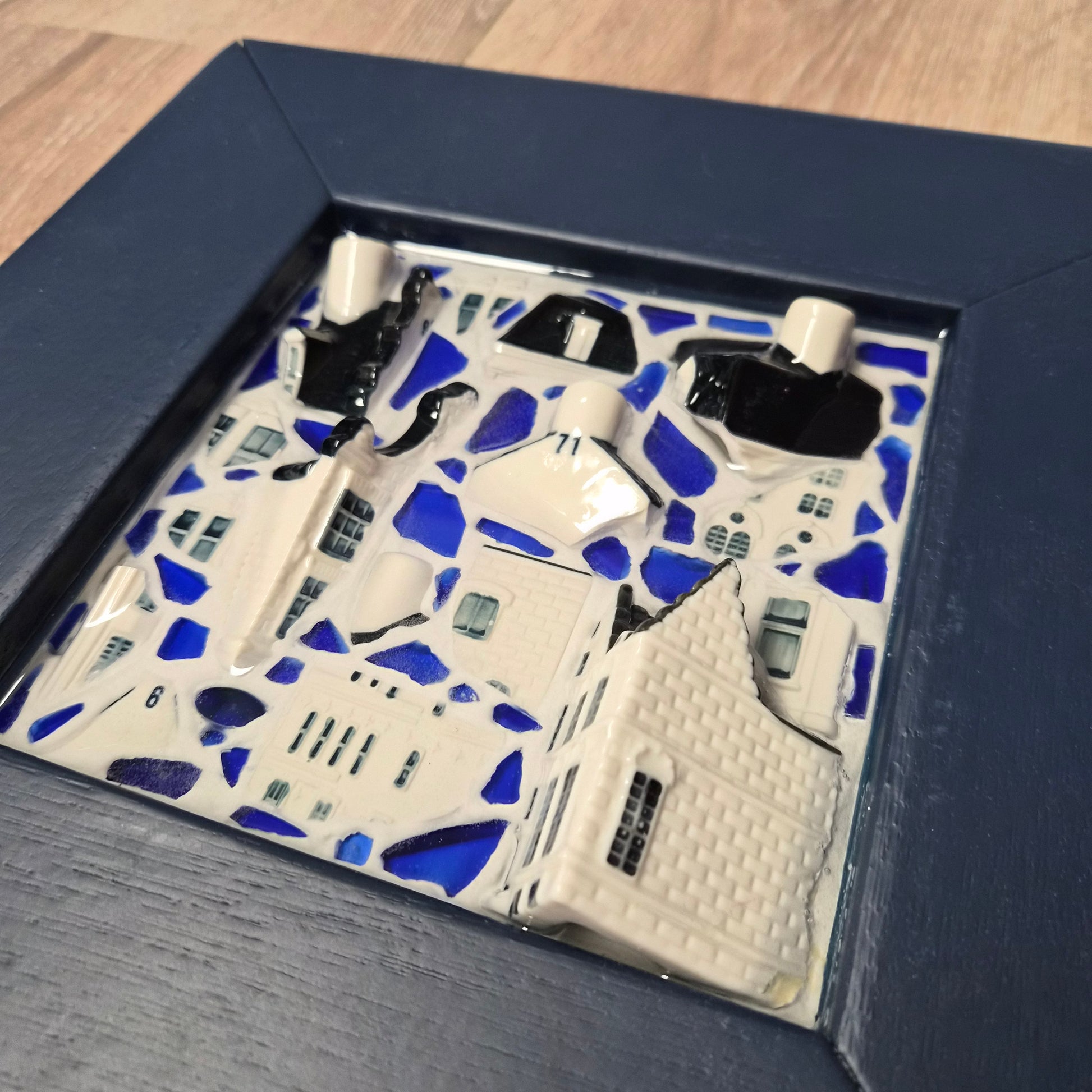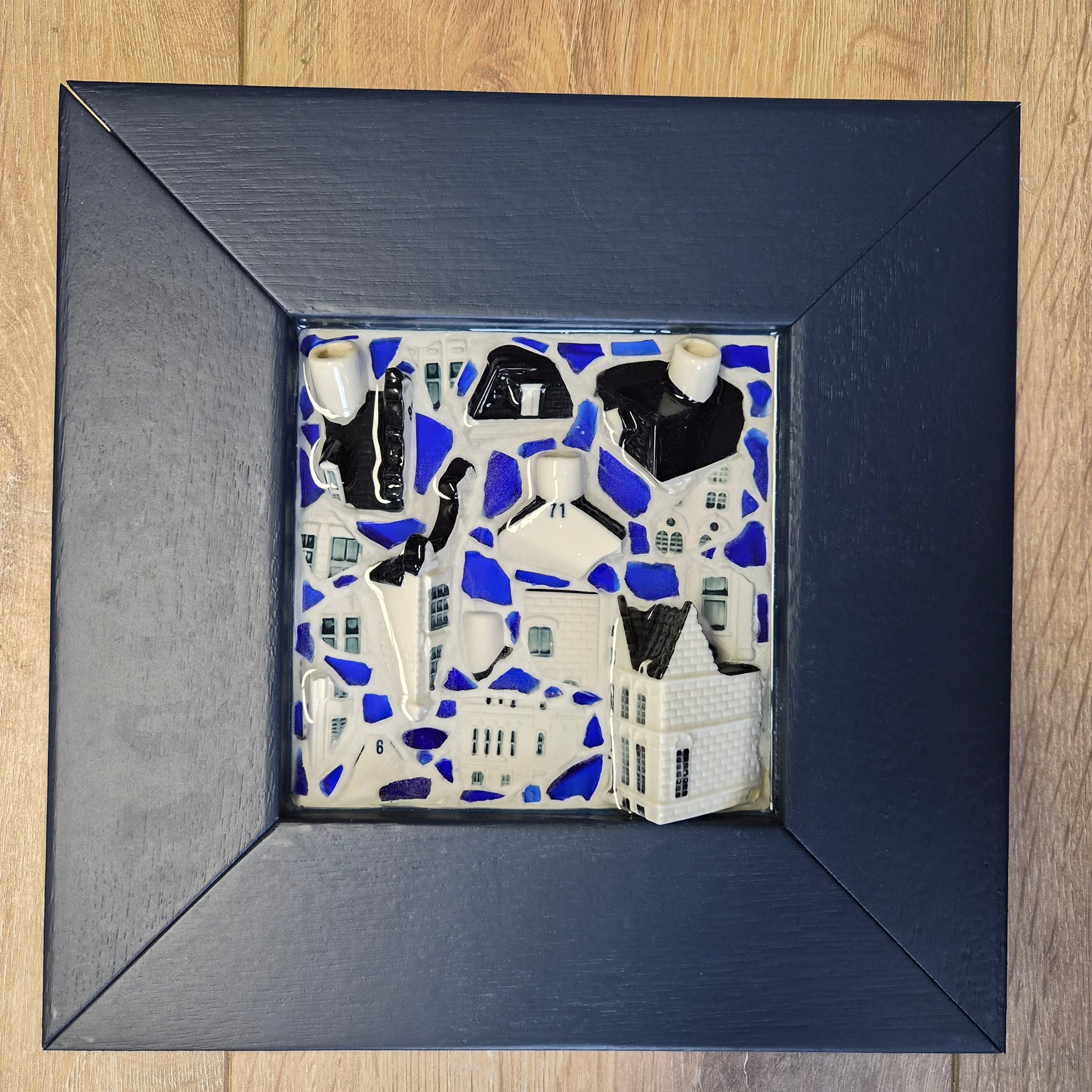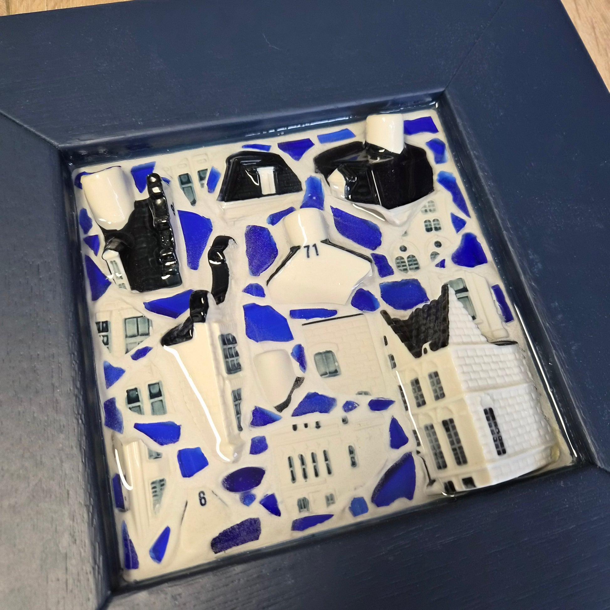 Crafted entirely by hand, each piece is made using an array of carefully sourced, recycled materials. The mosaic incorporates fragments from the iconic KLM houses, which are sourced directly from the factory that manufactures them for KLM—ensuring that no new houses are damaged or destroyed in the process. Additionally, the piece features fragments of blue recycled glass, repurposed from used wine and water bottles.