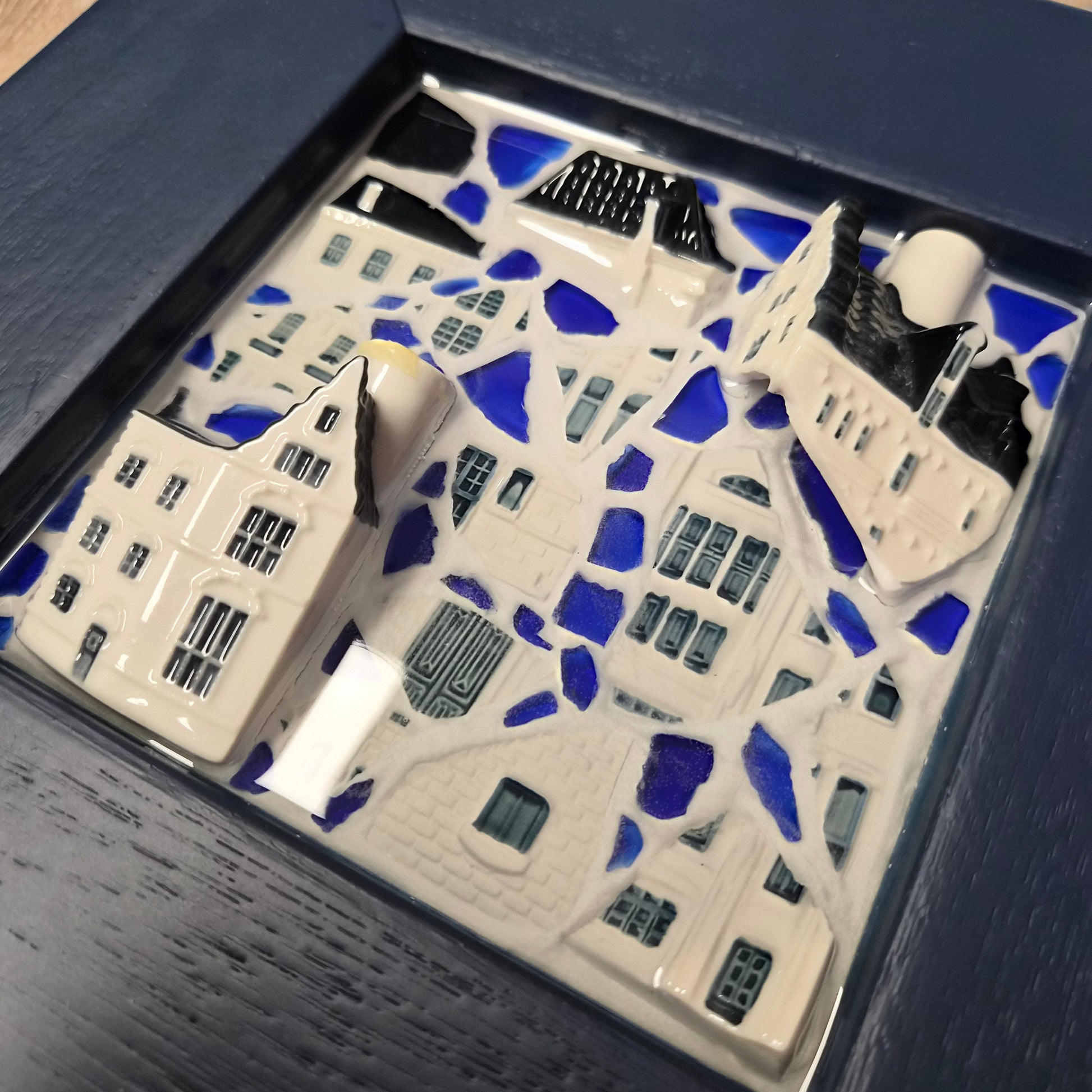 Crafted entirely by hand, each piece is made using an array of carefully sourced, recycled materials. The mosaic incorporates fragments from the iconic KLM houses, which are sourced directly from the factory that manufactures them for KLM—ensuring that no new houses are damaged or destroyed in the process. Additionally, the piece features fragments of blue recycled glass, repurposed from used wine and water bottles.