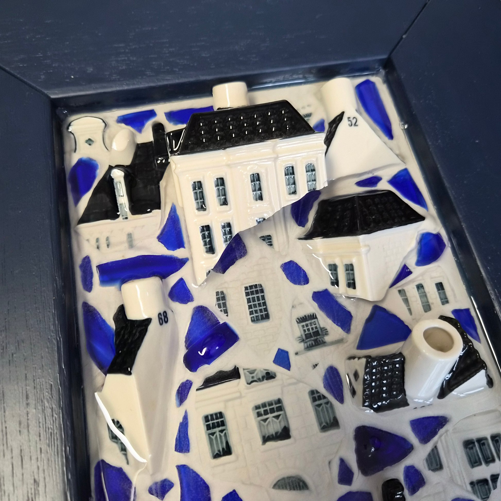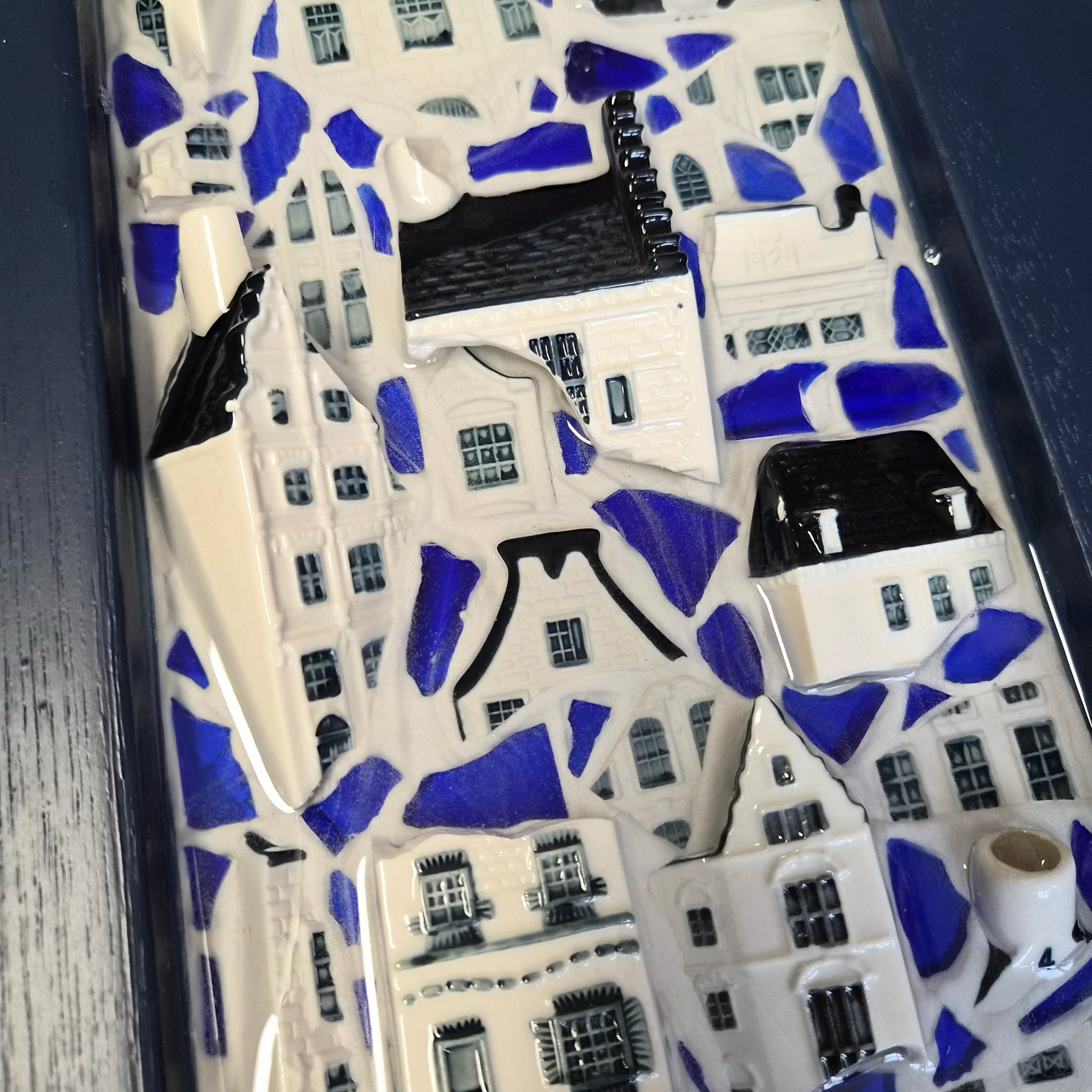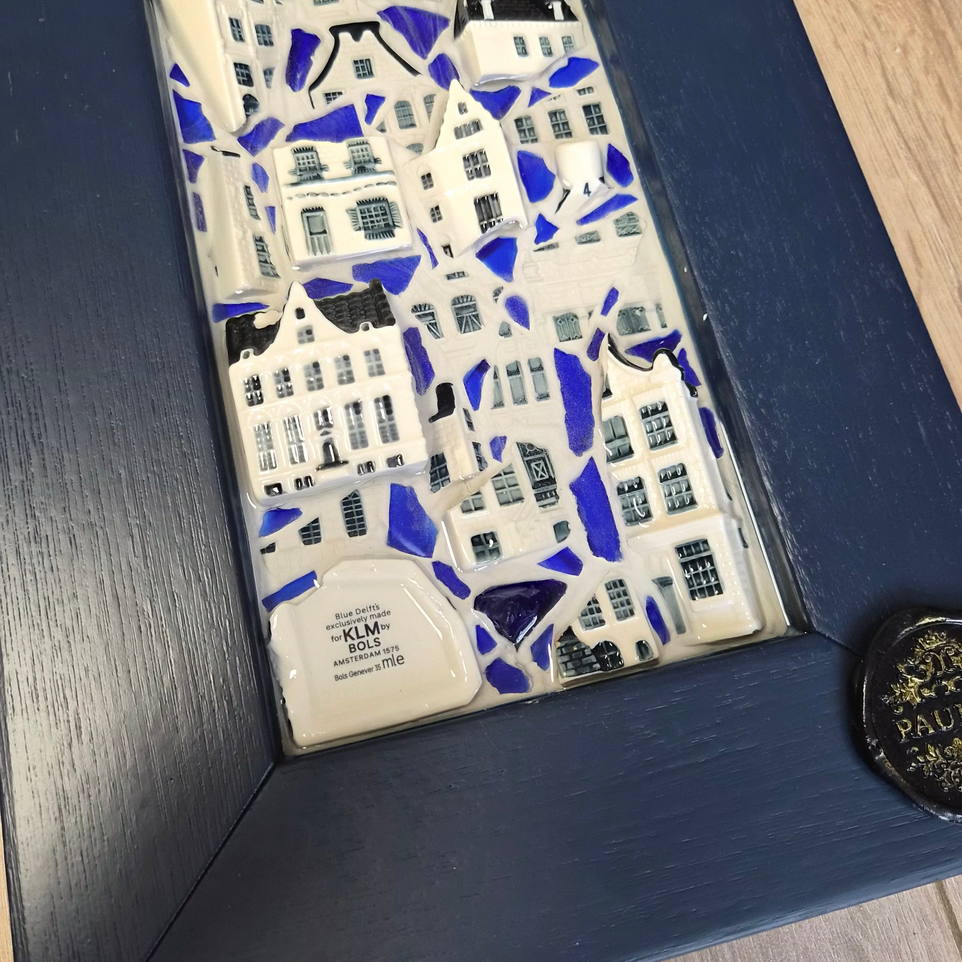 Crafted entirely by hand, each piece is made using an array of carefully sourced, recycled materials. The mosaic incorporates fragments from the iconic KLM houses, which are sourced directly from the factory that manufactures them for KLM—ensuring that no new houses are damaged or destroyed in the process. Additionally, the piece features fragments of blue recycled glass, repurposed from used wine and water bottles.